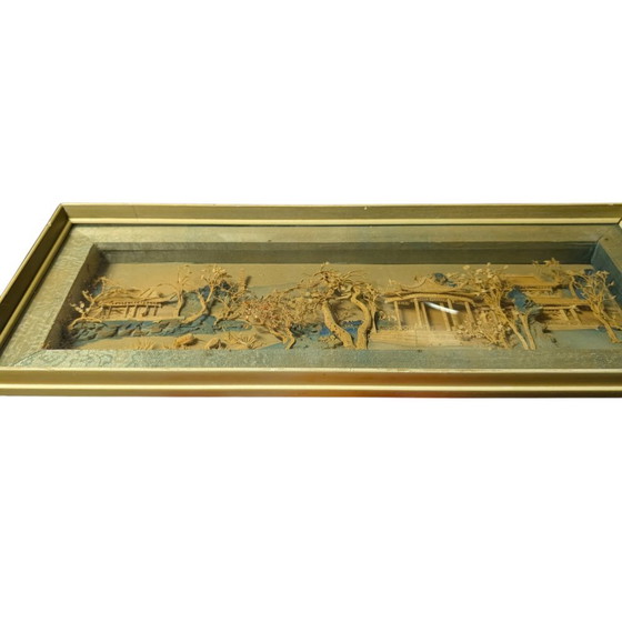 Discover the refined beauty of this Chinese cork diorama, a masterpiece of three-dimensional art that brings a serene Asian landscape scene to life. Measuring 18x50 cm, this unique piece is a stunning addition to any wall, offering a window into a world of tranquility and elegance. The detailed, handcrafted design utilizes cork and wood, set in a glass frame, and depicts a traditional Asian landscape featuring delicate trees and architecture. Perfect for lovers of Asian art and culture, and an ideal gift for special occasions. Add a touch of exotic charm to your interior with this beautiful artwork. Contact us today for more information or to add this unique piece to your collection. The back of the frame must be glued.