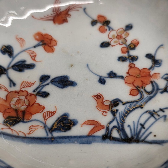 Antique Chinese Imari porcelain capuchin saucers, dating from the mid-18th century. These beautiful Chinese porcelain saucers feature floral and bird motifs. They have a lobed rim, and the underside has a brown glaze. One of the saucers is slightly thicker and opaque, and all are in pristine condition without hairlines.