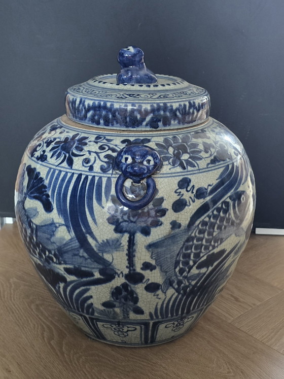 Very nice Chinese XXL pot with fish pond image. Colors Blue / Grey In China, the fish symbolizes abundance and happiness.