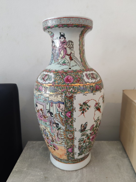 A 47cm vase from a private collection in Northern Germany, crafted in the early Republican period (c. 1915–1935) in the style of the late Guangxu era. A high-quality example of the Hzü enamel tradition, featuring slightly raised, multi-layered enamel painting, finely detailed figures, and warmly applied gold accents. These characteristics clearly distinguish the piece from simple, flat-painted Famille Rose mass-produced ware.