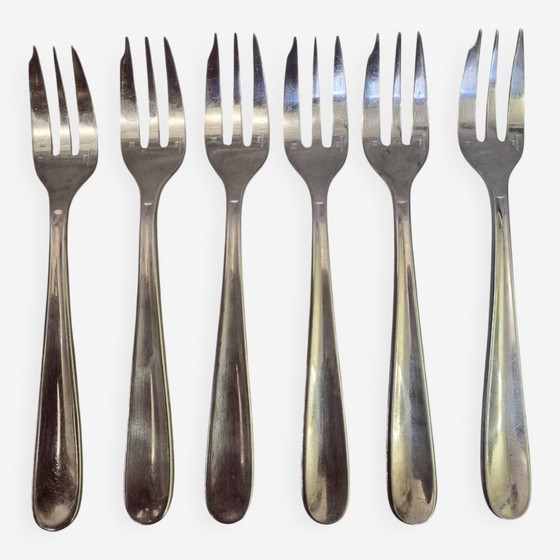 6 cake forks from the Christofle silverware house, Art Deco model, very sober, French class! I also have other pieces of this service for sale, silver-plated metal, traces of use see photos.