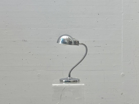 This distinctive table lamp embodies the functional yet elegant design approach of the 1960s. Crafted from chrome-plated metal, it impresses with its clean, technical lines and reflective surface, which subtly reflects light and its surroundings. The classically designed, hemispherical lamp head features a flexible gooseneck for precise positioning – ideal for focused task or reading light. The stable, round base ensures stability, while the integrated rocker switch on the lamp head allows for convenient operation. The combination of cool chrome, functional flexibility, and compact design makes this lamp a versatile piece – whether as a stylish desk lamp, on a sideboard, or as an accent light in a living room.