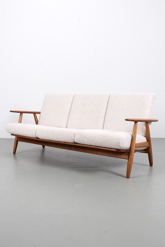 Cigar sofa GE 240/3 by Hans Wegner for Getama Denmark. A beautiful oak version with lovely patina. This sofa has been reupholstered and features a beautiful slatted back panel, making it ideal for freestanding placement. In good vintage condition.