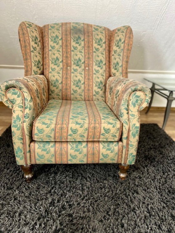 You can already picture yourself sitting in this delightful classic (smoking) chair, by the fireplace or among the books in the library. It is also an eye-catcher in a classic interior, for example in a corner where you can retreat with a good book or magazine. The chair's upholstery features a floral pattern. The seat is 53 cm deep. The backrest is 73 cm high. The seat height is 43 cm. The feet are made of oak. It has sturdy canvas upholstery, but has faded slightly over time.