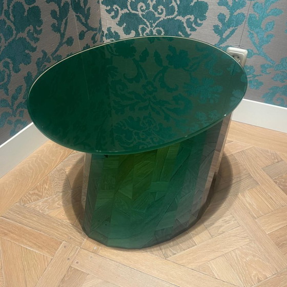 The Pli Side Table Low, designed by Victoria Wilmotte in 2016, is a refined and contemporary side table where form and material come together perfectly. The base is crafted from folded, high-gloss polished stainless steel and finished in the color topaz green, where a special coloring technique ensures a deep and luxurious appearance. The oval tabletop is made of crystal glass and lacquered on the underside in a matching green shade (RAL 6009), creating an elegant play of colors and added depth. The combination of sleek steel and refined glass gives the table a modern and sculptural look, suitable for both minimalist and more distinctive interiors. To protect the floor, the table is fitted with black felt glides. The dimensions are 56 cm wide, 42 cm deep, and 48 cm high.