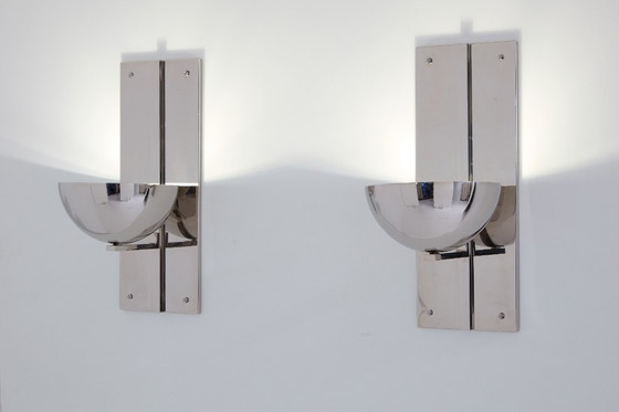 This is a unique pair of French wall lights designed by the famous architect Claude Parent in 1992 for a mansion project in the 16th arrondissement of Paris. The structure is made of polished nickel steel, with a large globe with a nickel finish on the outside, and white enamelled on the inside. They are truly elegant and timeless French modernist pieces. They have been fully repolished, electricity checked, and are in an amazing condition.
