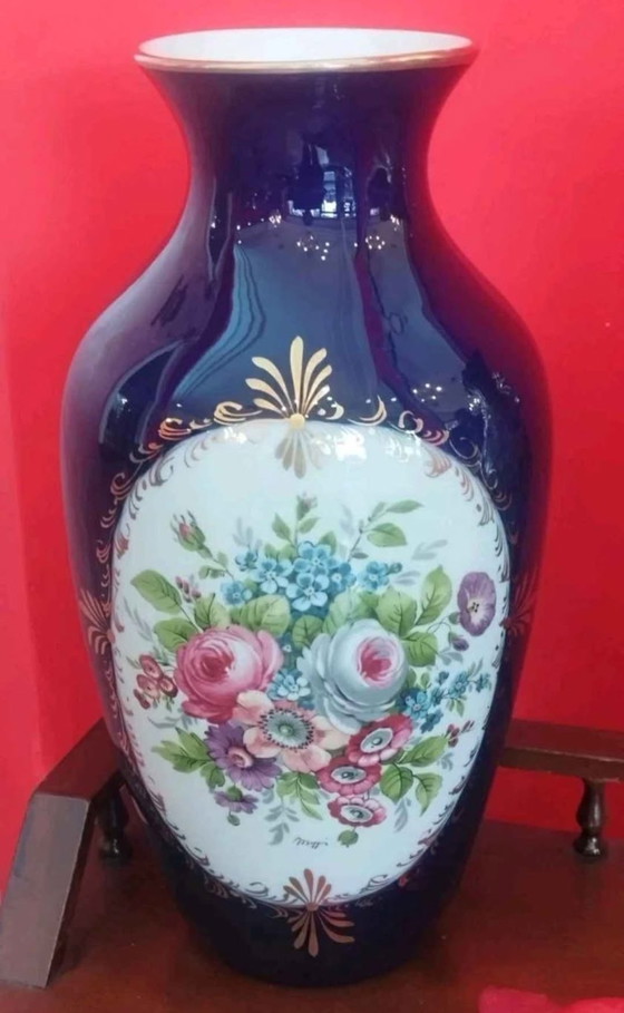 Splendid large 1960s Limoges porcelain vase, cobalt blue, with hand-decorated floral motifs, signed by the manufacturer, and details in pure gold.
