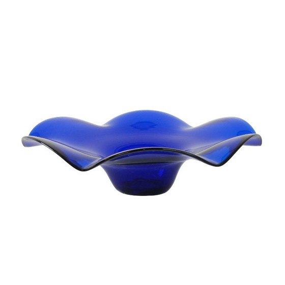 Cobalt glass platter with a frill, manufactured in the 1970s. Danish production.
