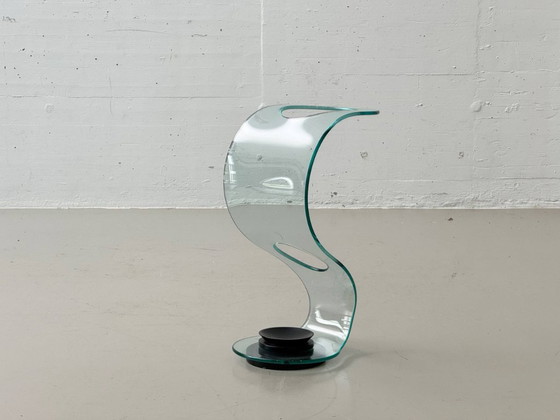 The Cobra sculptural umbrella stand by Elio Vigna for FIAM Italia is an iconic example of Italian glass design. Crafted from a single, 10 mm thick, curved sheet of float glass, the piece impresses with its flowing, dynamic form and the characteristic cutout, which elegantly combines lightness and function. The clear glass structure contrasts strikingly with the black lacquered metal base, which ensures stability and clean water absorption. A high-quality design object that is both functional and a striking sculpture in any room – typical of FIAM.