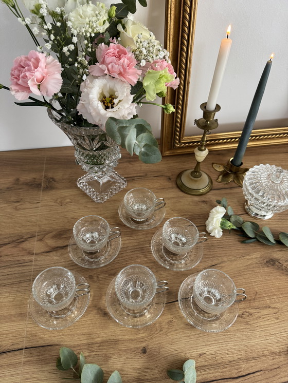 Beautiful vintage set of 6 clear glass cups with matching silver spoons.