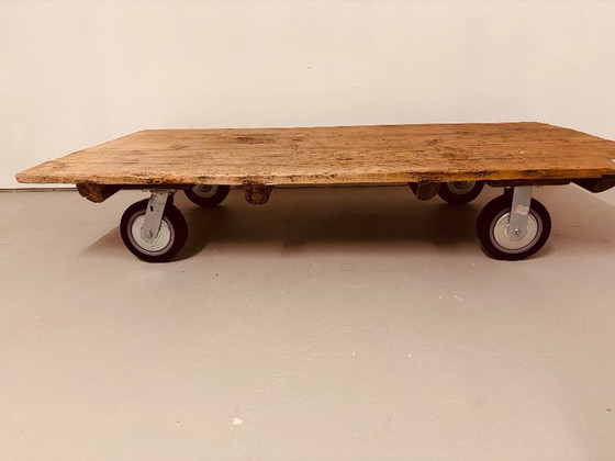 This unique coffee table, crafted from an antique window shutter in an industrial style, combines rustic charm with practical mobility. The sturdy wooden tabletop rests on robust metal casters, which not only create a striking look but also offer flexibility in placement.