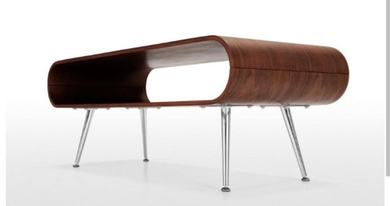 This is a stylish mid-century modern coffee table featuring a sleek wooden design with a rich walnut brown finish. The table is supported by sturdy metal legs, adding a touch of elegance and stability. Its open design provides ample space for storage or display, making it a functional and attractive addition to any living room.