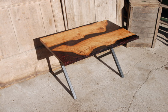 Cherry wood coffee table with black resin casting and hints of red. The legs are made of iron and painted black with a hammered effect. Dimensions: 54x88cm, height 53cm, thickness 3.5cm.