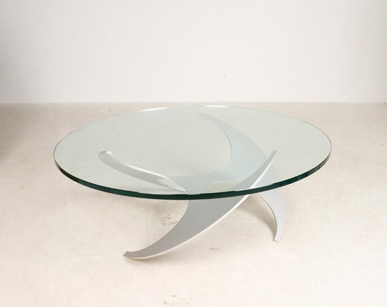 Coffee table by Knut Hesterberg, Ronald Schmitt, "Propeller" model, 1960s, aluminum frame with solid glass top.