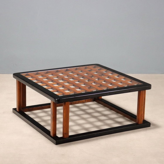 Elegant coffee table with an ebony-stained wood base and a top made of woven stained larch slats, complete with a clear glass top. Very good condition, fully restored.