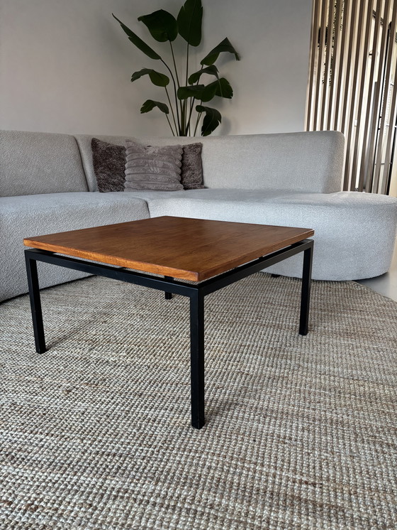 Side table or small coffee table designed by Gijs van der Sluis in the early 1960s. This table belongs to the Van der Sluis model 36 chairs and has the same sturdy black metal frame and a floating teak veneer top. Beautiful Dutch Mid-Century Modern.
