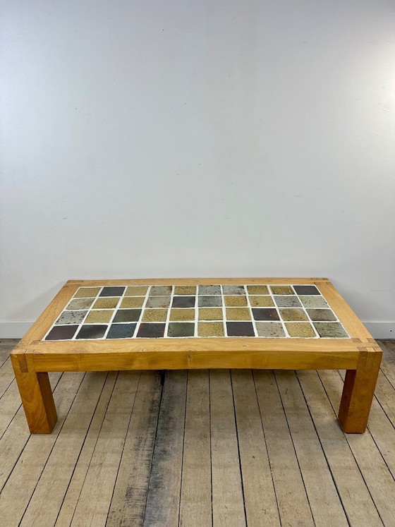 Brutalist coffee table in solid elm with a vintage Maison Regain ceramic stoneware top, circa 1970. Each tile is unique, but when placed side by side, they form a harmonious and distinctive whole. A piece of character to place in your living room to create a warm and inviting atmosphere. Cross-laminated joinery, high-quality traditional joinery.