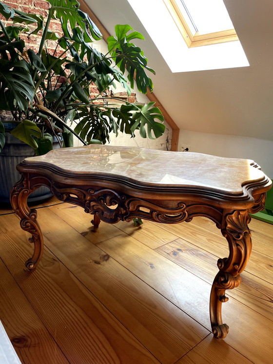 Coffee table consisting of marble stone and wooden support. Very nice antique piece with detail markings in the wood. One small scratch (cfr photo). Otherwise beautifully maintained.