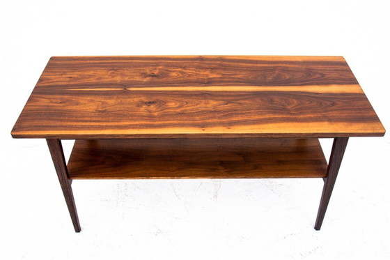 Table top veneered with richly grained walnut, the table also has a second top mounted halfway up the legs.