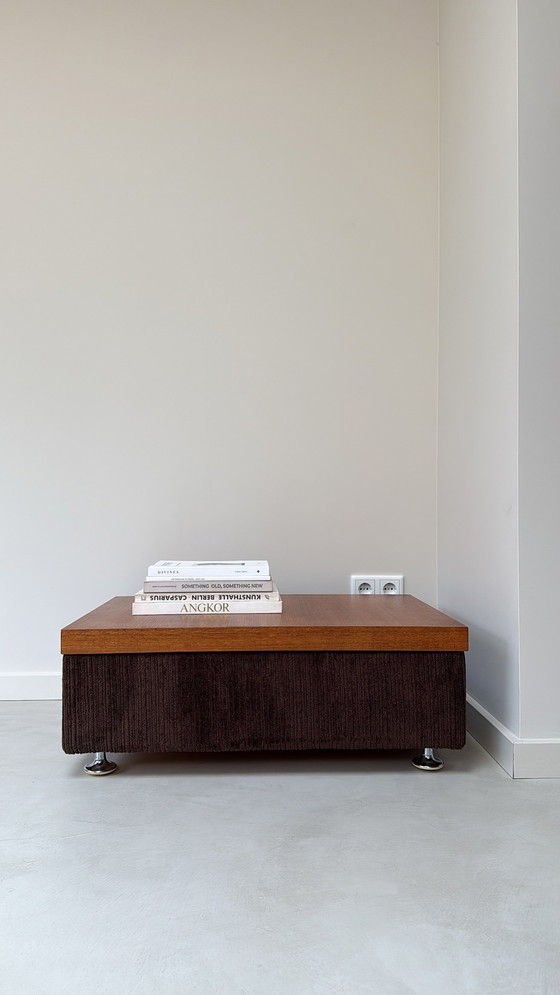 Coffee table with brown corduroy fabric and a wooden top. Dimensions: 80.5W x 50.5D x 30H cm. The chrome legs make it very attractive, and a plus is that there is space to store items inside the coffee table. The table is in good vintage condition, with minimal signs of use commensurate with its age. Can only be picked up in Maastricht, or delivery by arrangement.