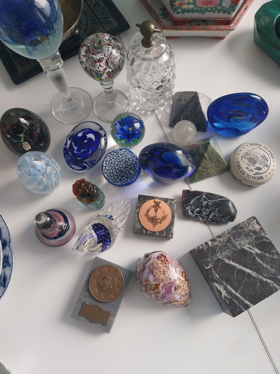 Discover an exquisite collection of paperweights, each telling a unique story through its patterns and vibrant colors. These glass and marble pieces, with their deep blue hues and crystal-clear transparency, are works of art that add a touch of elegance to any desk or workspace.