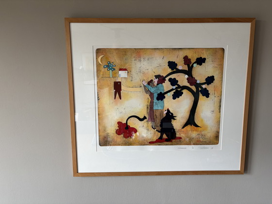 This work, titled Romance (1999), depicts a dreamy and narrative scene in which humankind, nature, and fantasy converge. The artist plays with symbolism and simplified forms, giving the work an almost fairytale-like quality. The warm earth tones contrast beautifully with the graphic black shapes of the tree and the animal, while subtle details create an intimate, melancholic atmosphere. The work invites interpretation and continues to reveal something new with every glance.