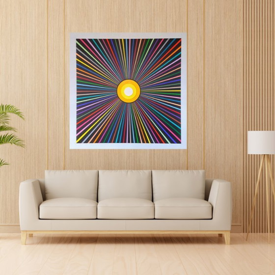 Ideal for lovers of color, op-art and geometric abstraction, this original painting exudes energy, joy and dynamism. A powerful statement piece that instantly grabs attention and continues to inspire.