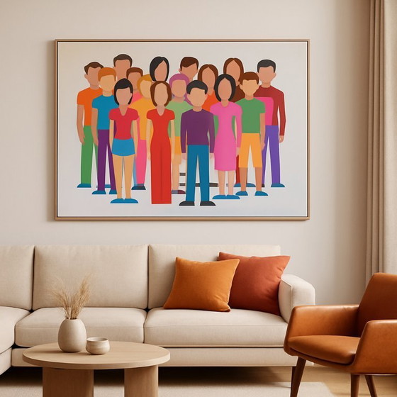 This original hand-painted artwork depicts an abstract crowd of people in minimalist style. The bright colors, geometric shapes and lack of faces make it a powerful and intriguing statement about individuality and connection.