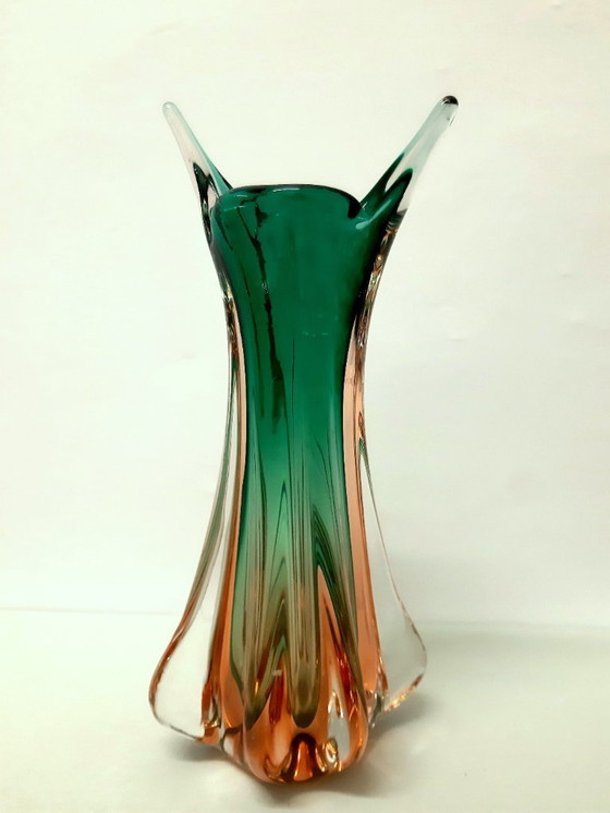 This exquisite Murano glass vase is a testament to the timeless elegance of Italian craftsmanship. Its vibrant hues of green and orange blend seamlessly, creating a captivating visual display that is both bold and sophisticated. The vase's fluid form and delicate transparency are characteristic of the renowned Murano glasswork, making it a perfect centerpiece for any refined setting.