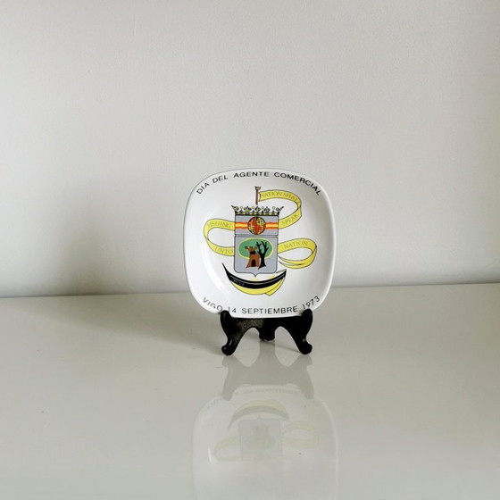 Commemorative porcelain plate, designed to celebrate Commercial Agent's Day in Vigo, Spain. It features a coat of arms in the center with heraldic symbols and a crown, representing the commercial institution. Around the shield is a yellow ribbon with the words "UNION," "COLLABORATION," and "INITIATIVE," key values in the commercial agent profession. Measures 12 cm.