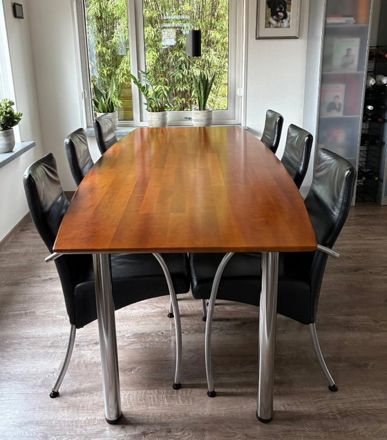 This complete dining set with six chairs offers a perfect balance between style and functionality. The table features a beautiful wooden top that adds warmth and elegance to any dining room. The six matching chairs are upholstered in luxurious black leather and have a modern metal frame, creating a contemporary look.