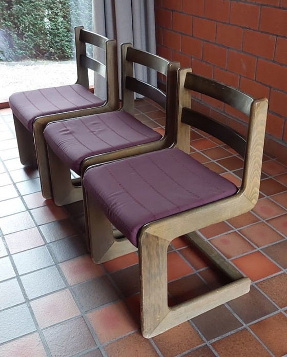 Experience the charm of the 70s with this beautiful dining set, complete with six Casala Cantilever sled chairs. With their sturdy wooden frame and comfortable purple textile seat, these chairs bring a touch of vintage elegance to your interior.
