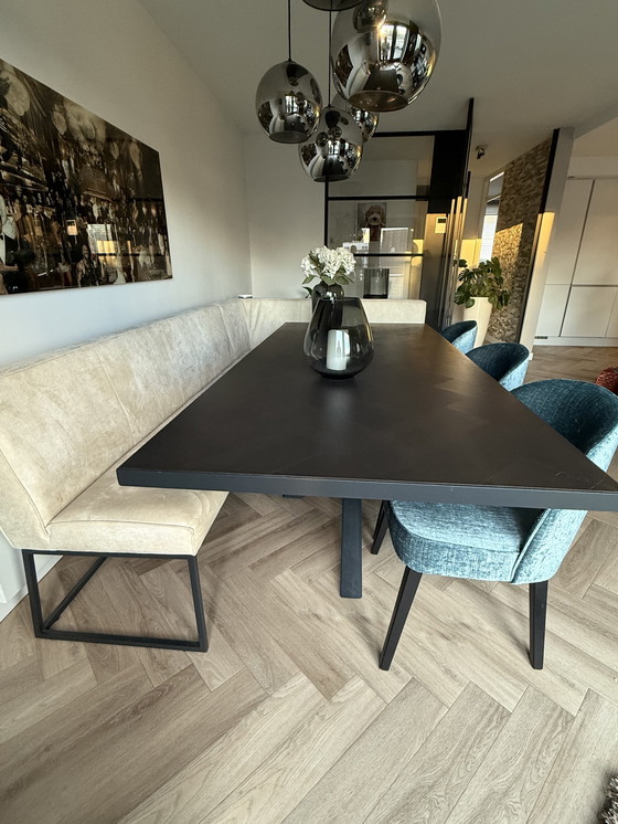 Transform your dining area with this complete dining set, designed to bring a touch of modern elegance to your home. The set features a spacious black wooden table, perfect for hosting family dinners or entertaining guests. Accompanying the table is a comfortable beige bench, offering ample seating with a chic, minimalist design. The three elegant blue (petrol) chairs add a pop of color and sophistication, supported by sturdy metal frames for lasting durability.