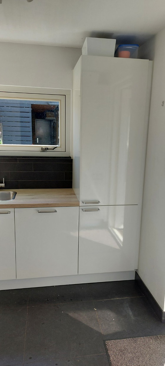 White high-gloss kitchen, 9 years old, including AEG dishwasher, Samsung refrigerator, SMEG gas stove including oven, and Francke boiling water tap including 5-liter boiler (1 year old).