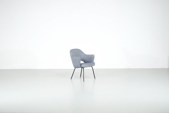 No. 71 "Conference" model armchair in blue fabric on black metal frame. This chair comes directly from the IBM offices with a plaque and the Knoll International LTD New-York label. Designed by Eero Saarinen for Knoll International, USA 1957. Designer - Eero Saarinen. Producer - Knoll International. Model - Conference No 71 . Production period - 1970s. Dimensions - Width 67 cm x Depth 60 cm x Height 80 cm. Materials - Fabric, metal. Color - Blue, White, Black. Condition, comments - Good condition, a few scratches. Slight wear from age and use (see photos). If you have any further questions or need more photos, please don't hesitate to contact me. For a shipping quote, please contact me.