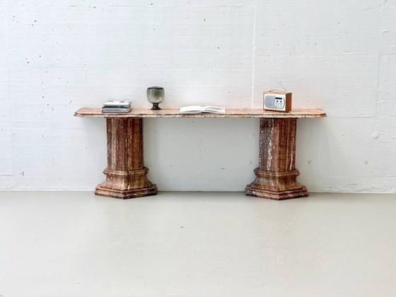 The overall condition of the furniture is very good. The marble surfaces have a beautiful natural patina and only minimal signs of age-related wear, particularly on the edges. The surface shines evenly and shows no visible flaking. The construction is stable and the individual parts are neatly joined. The console table presents itself as a high-quality, expressive individual piece with a strong presence.