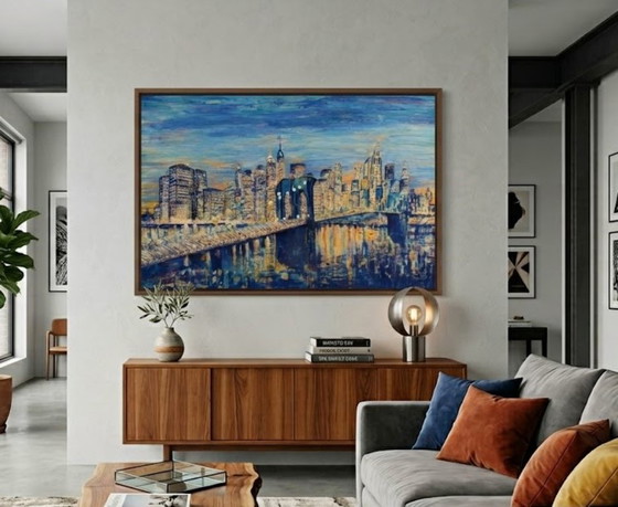 Titled "Brooklyn and Twilight," this unique artwork depicts the iconic New York City skyline at sunset, with Brooklyn illuminated by twilight colors.
