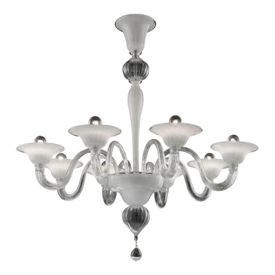 Elegant design for this chandelier with hand-made white and silver leaf in Murano glass