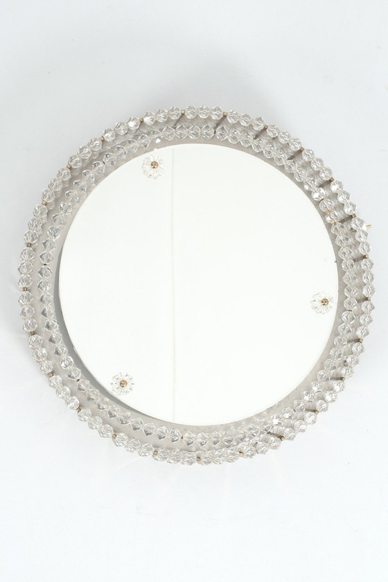 Contessa Leuchten round mirror with lighting. The mirror is made of metal and decorated with acrylic beads. The light and the beads create a beautiful indirect light.In good vintage condition. Measurements: Ø 38 cm; D. 9 cm.