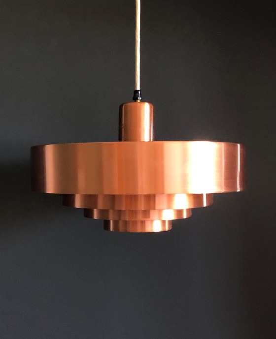 Copper suspension lamp by Jo Hammerborg for Fog & Morup. Denmark 1960. This is the "Roulet" model, one of the first lamps designed by Jo Hammerborg for Fog & Morup. With its central rings, the copper suspension diffuses a warm light. Very good condition.