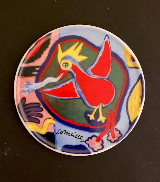 Set of 6 Ceramic Coasters – Corneille (CoBrA) A rare and colorful set of six ceramic coasters designed by internationally renowned artist Guillaume Corneille (1922–2010), co-founder of the avant-garde CoBrA movement. Each piece depicts a unique scene in Corneille’s signature style: expressive lines, vibrant colors, and stylized birds and figures that evoke dreams, freedom, and fantasy.