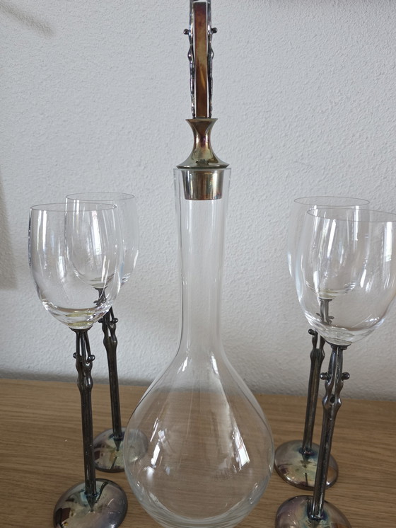 Beautiful decanter and glass set by Corrie van Ammerlaan. The set includes a decanter and four glasses, all made of high quality glass with metal accents. The glasses have a unique metal base, the decanter has a metal stopper. This is a unique, rare set in fine condition with certificate and original box. The box has light signs of use.