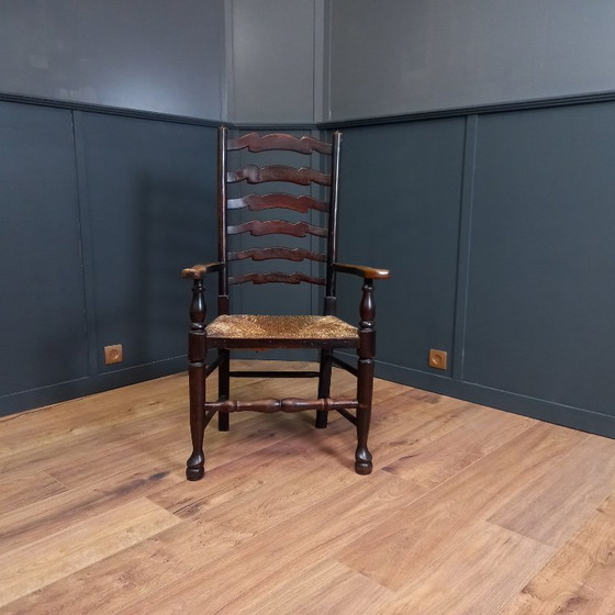 Late 18th-century Georgian-style country chair from Lancashire, crafted from high-quality yew wood. This antique chair is characterized by its open ladder back, turned uprights with domed and ribbed ends, and elegantly undulating crossbeams. The authentic piece of furniture exudes a warm, weathered patina and has been fully inspected, is sturdy, and in excellent condition. Thanks to a carefully applied wax finish, the chair is ready for immediate use, and with proper care, this timeless Georgian chair remains a durable and characterful addition to any classic, country, or vintage interior.
