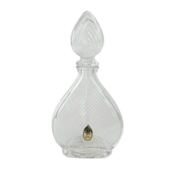 A high-quality crystal glass carafe, marked with the manufacturer's sticker Prod. ERRE. It features decorative grooves in the form of symmetrical vertical lines, which give it elegance and a unique shine. The teardrop shape is repeated in both the body and the matching stopper, emphasising the consistency of the design. Ideal for serving wine, whisky or liqueurs, as well as an impressive decoration in a vintage or classic style.