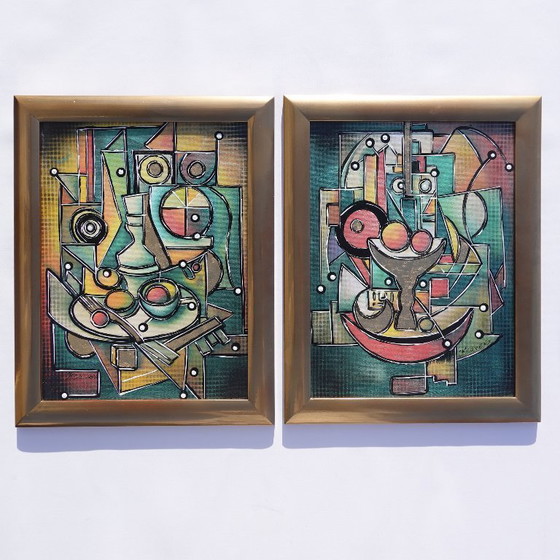 Cubism A1439 - original abstract acrylic paintings with golden leaf folie on canvas board in golden frame - READY to HANG diptych by artist Ksavera
