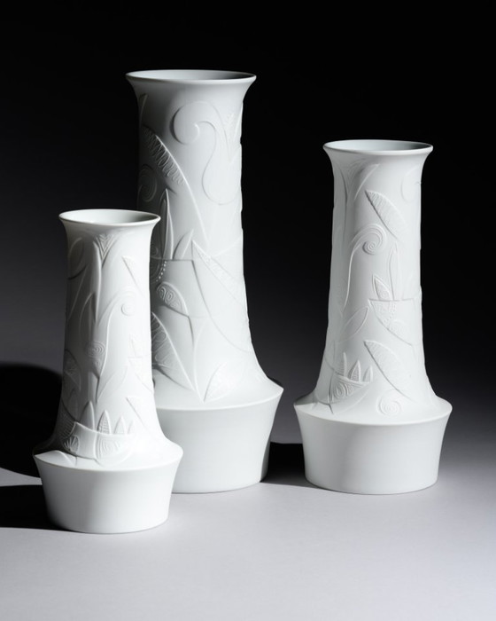 All three vases are produced in fine white bisque porcelain. The unglazed, matte surface enhances the sculptural quality of the relief decoration, allowing light and shadow to articulate the subtle modelling. Bisque porcelain was particularly favoured in mid-century design for its tactile purity and timeless elegance.