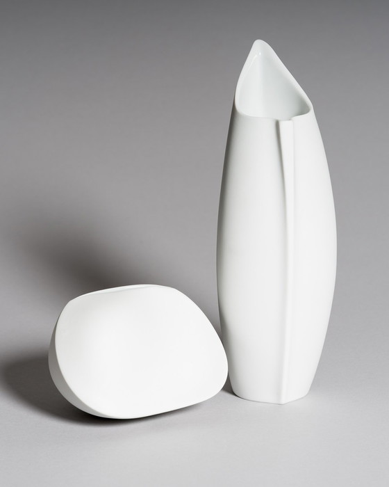 Elevate your space with this thoughtfully curated porcelain duo, blending the expressive Italian modernism of **Lino Sabattini** with the restrained Bauhaus-inflected minimalism of **Uta Feyl**. Produced by **Rosenthal's Studio Line** in the 1980s, both pieces exemplify a sculptural approach to functional objects—each holding its own as a miniature artwork in pure white *bisque* porcelain.
