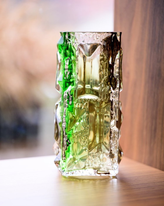 The vase offered here features a rectangular footprint and thick walls infused with fused tones of emerald green and amber brown (a variant of the Sommerso technique). Its surfaces are embossed with bold, geometric reliefs: ridged, mirrored, and distorted like tectonic structures or Brutalist facades. This language of modularity, repetition, and abstraction is strongly reminiscent of Urban’s Series 981 and 983 for Rosice, and of Jurnikl’s cube-based textures from Hermanova Hut.