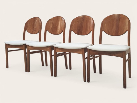 Beautiful set of four Danish vintage chairs from the 1970s. The chairs were manufactured by Korup Stolefabrik. They have a natural Scandinavian look due to the sleek design and use of clear lacquered oak. The chairs have been reupholstered and feature quiet matte light beige upholstery.