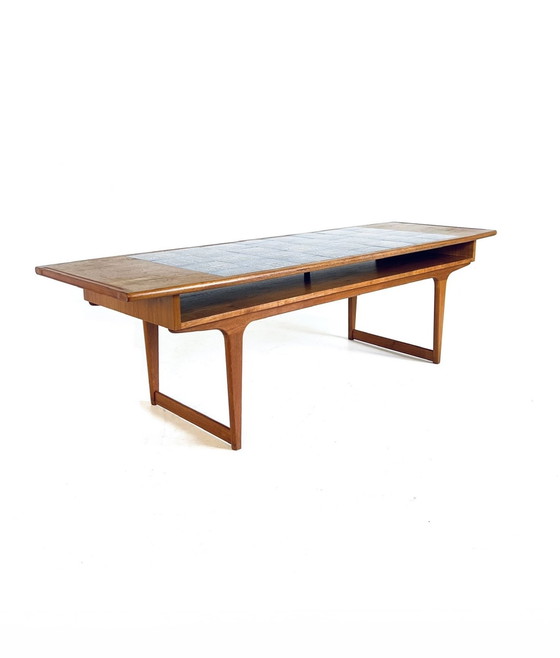 Vintage Danish coffee table from the 1960s, made of solid teak with inlaid ceramic. Very nice model, tapered leg nicely organically designed. Tapered and connected by a crossbar. The top consists of a double tier which gives the table an "airy" look. A reading shelf at the bottom and a teak top that tapers at the ends. The top is inlaid with Danish ceramic in beautiful bright blue color. A beautiful interplay of lines as a feast for the eyes. In short, a very nice unique table as a true eye-catcher in your interior. In very clean condition with a few light scratches on the top, see photos. Afmetinf Height 53cm Length 181cm Width 60cm